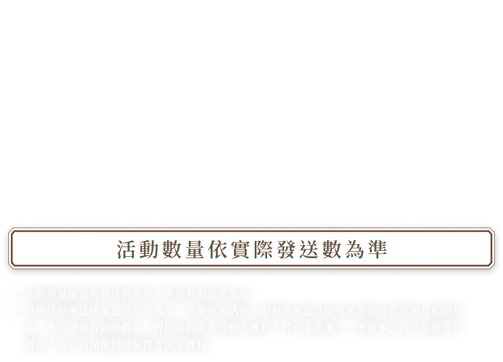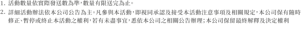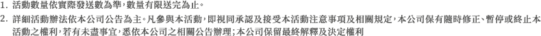 6. 本活動之獎品不得轉換、轉讓或折換現金,中獎獎品均以實物為主。獎項詳細內容與規格以實物為準,網頁示意圖片僅供參考。